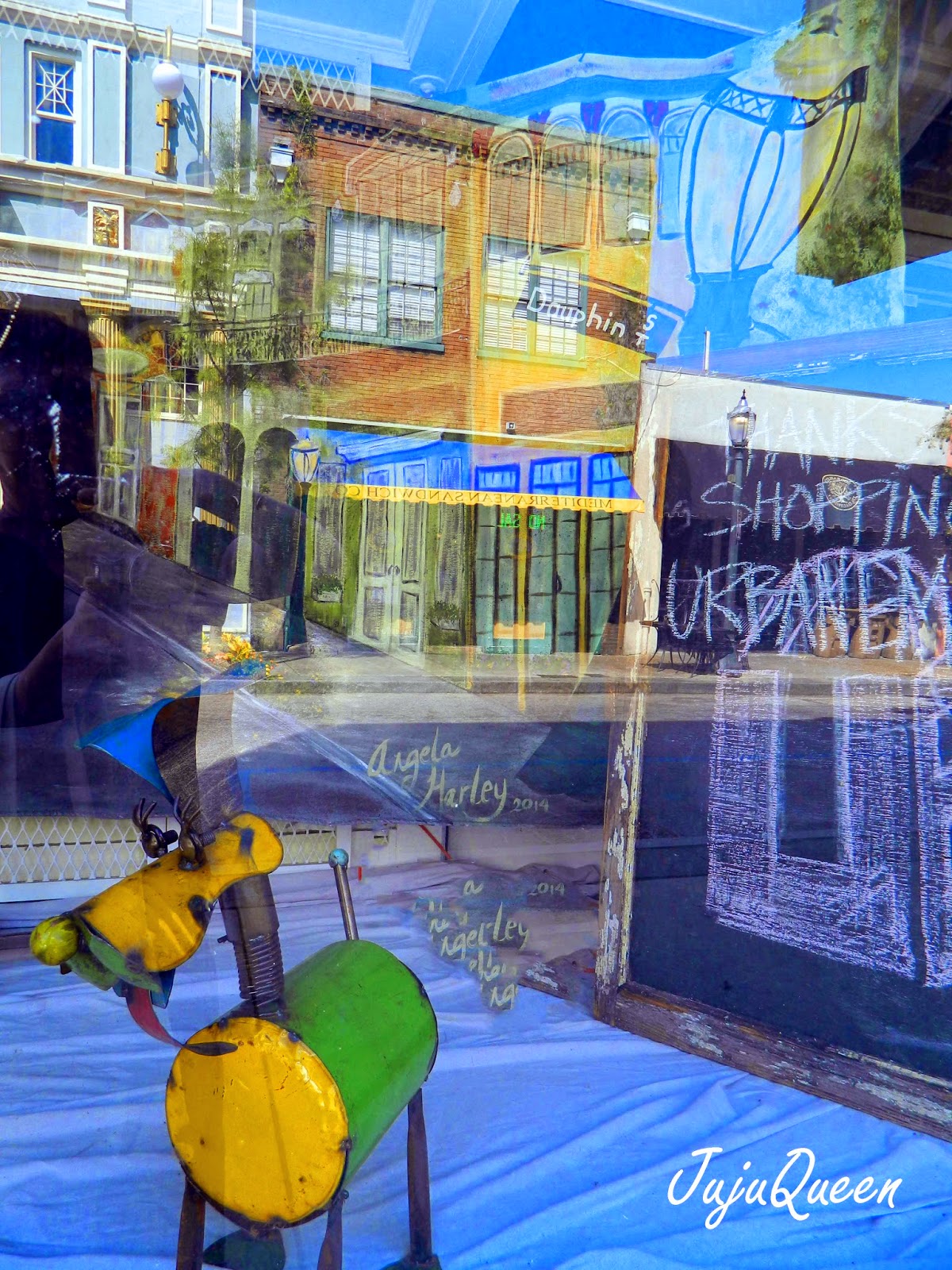 I love the dichotomy in the photograph above- The serenity of the prayer garden inside the gates at the cathedral, and the vibrancy represented by the art in the window of the space across the street.